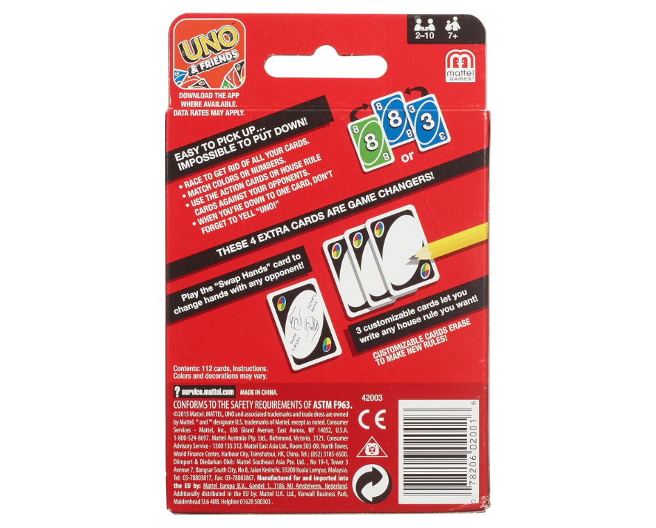 UNO is the fast-paced and exciting card game thatβs been a family favorite for decades! Perfect for game nights, travel, and parties, UNO is easy to learn and packed with strategic action cards that keep every round fresh and competitive.