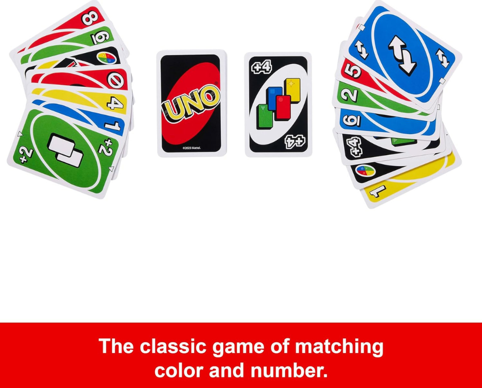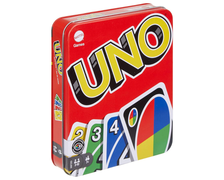 The beloved UNO card game is easy to learn and impossible to put down! Match cards by color or number, play special action cards to strategize, and shout “UNO!” when you’re down to one card! This fast-paced, family-friendly game is perfect for kids, teens, and adults (ages 7+). Includes 112 cards, instructions, and a sturdy tin for easy storage and travel!
